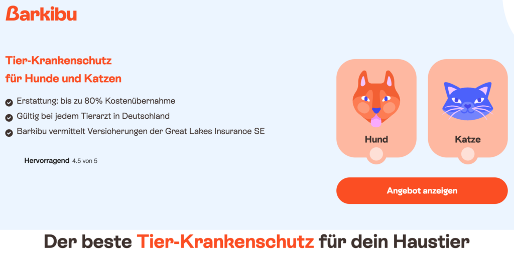 Unser Test hat gezeigt: Barkibu ist die am besten bewertete Haustierversicherung auf Trustpilot und überzeugt mit einem guten Kundenservice, einer schnellen Bearbeitung und praktischen Extras. Die vollständig digitale Versicherung übernimmt bis zu 80 % aller OP- und Behandlungskosten in jeder Tierarztpraxis Deutschlands. Überzeugen Sie sich selbst durch einen Test!