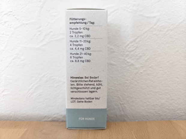 Für Hunde mit fünf bis zehn Kilogramm empfiehlt CBD VITAL täglich zwei Tropfen, das entspricht 2,2 mg CBD. Für Hunde unter fünf Kilogramm nennt der Hersteller zum Einstieg einen Tropfen. Damit bleibt die Dosierung einfach und nachvollziehbar, allerdings ist die Staffelung relativ grob. Wenn euer Hund sehr sensibel reagiert oder ihr unsicher seid, ist eine Rücksprache mit der Tierarztpraxis sinnvoll, da das Produkt keine medizinische Beratung ersetzt.