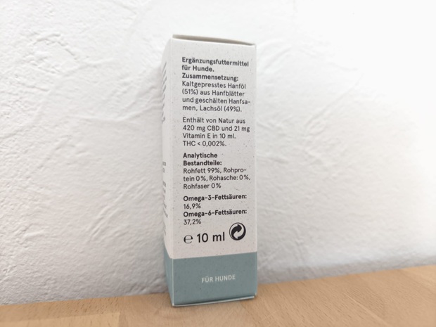 - Rezeptur: 51 % kaltgepresstes Hanföl, 49 % Lachsöl