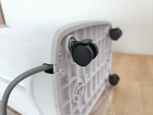 Beim Verschieben helfen mir die Transportrollen, und der Tragegriff ist dann praktisch, wenn ich über eine Schwelle muss. Das klingt banal, macht im Alltag aber den Unterschied zwischen „steht dauerhaft im Keller“ und „wandert bei Bedarf ins Bad“. Insgesamt wirkt das Gerät in dieser ersten Phase solide, ohne dass ich Materialwunder erwarte, zumal der Hersteller keine konkreten Werkstoffe ausweist.
