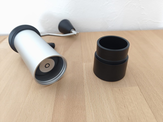 Die Traveler kombiniert anodisiertes Aluminium und Edelstahl, um robust zu wirken und dennoch Gewicht zu sparen. Aluminium findet sich unter anderem an Gehäuse und Auffangbehälter, Edelstahl wird für zentrale Teile wie Kontermutter, Kurbelarm und Achse verwendet. Mahlring und Mahlkegel bestehen aus Kohlenstoffstahl mit Black-Fusion-PVD-Beschichtung und das Mahlwerk hat laut Handbuch eine Härte von 63 HRC. Der Mix ist auf Langlebigkeit ausgelegt.