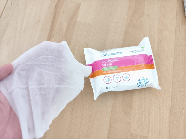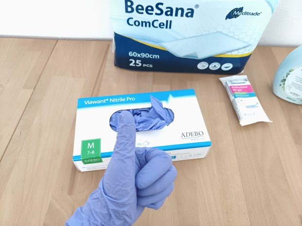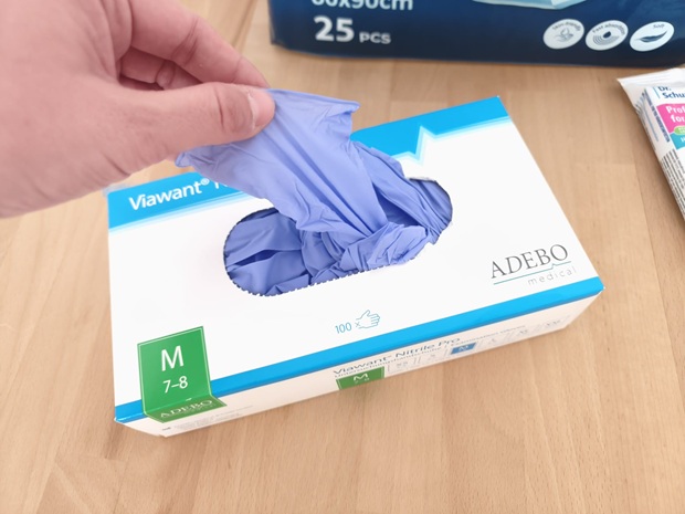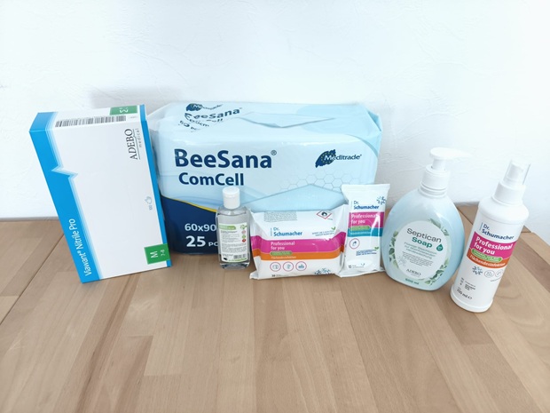 Am zweiten Tag setze ich mich mit dem sichtbaren Produktspektrum auseinander und ordne es typischen Pflegesituationen zu. Der Mix aus Handschutz, Desinfektion, Mundschutz, Bettschutz und Schutzkleidung deckt die üblichen Hygienefelder ab, die bei Körperpflege, Flächenreinigung und Infektionsschutz immer wieder auftauchen. Besonders praktisch finde ich, dass sowohl Flächendesinfektionsmittel (500 ml) als auch Flächendesinfektionstücher (60 Stück) vorgesehen sind, weil sich damit unterschiedliche Gewohnheiten bedienen lassen. Wenn im Alltag mal schnell etwas gereinigt werden muss, sind Tücher oft unkomplizierter, während Flüssigdesinfektion für regelmäßige Routinen sinnvoll wirkt.