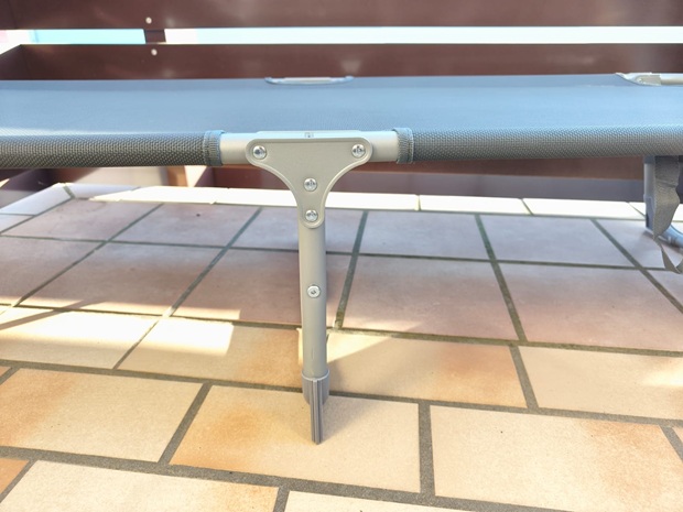 Das Gewicht liegt je nach Angabe bei ca. 6,8–7,1 kg. In der Regel lässt sich die Liege damit von einer Person tragen, zumal sie über zwei Tragegriffe verfügt. Für kurze Distanzen im Garten oder zum Auto ist das bequem, bei längeren Wegen spürt ihr das Gewicht allerdings deutlicher. Das liegt am stabilen Stahl- beziehungsweise Eisengestell.