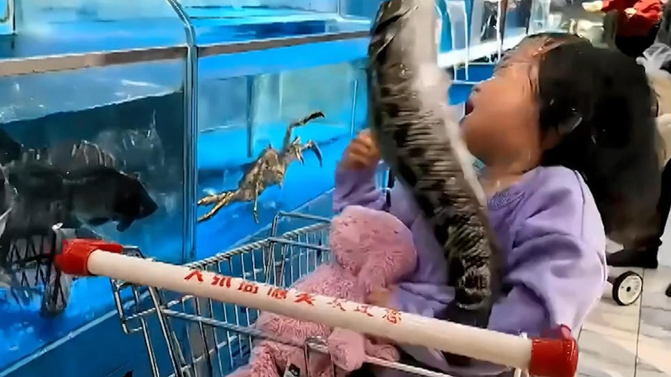 Achtung, hier fliegt ein Fisch! In einem Supermarkt in Sanmenxia, China wollen ein kleines Mädchen und ihr Opa eigentlich nur die Bewohner der Aquarien beobachten. Trotz vermeintlich sicherer Entfernung schießt plötzlich ein glitschiger Ausreißer direkt auf den Einkaufswagens des Kindes zu. Die skurrile Szene seht ihr im Video.